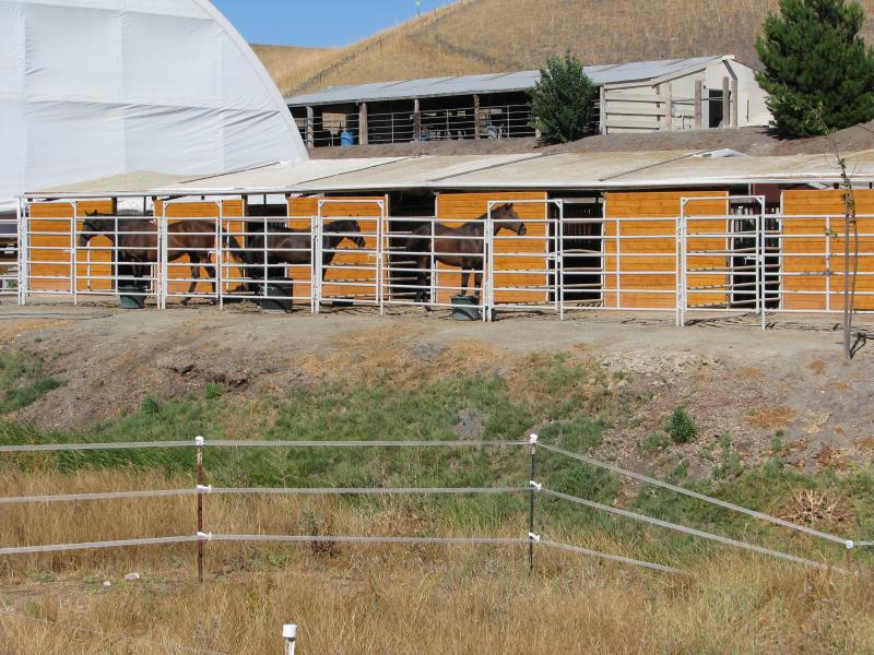 Horses fed 2x a day (2 flakes of grass or alfalfa/meal)